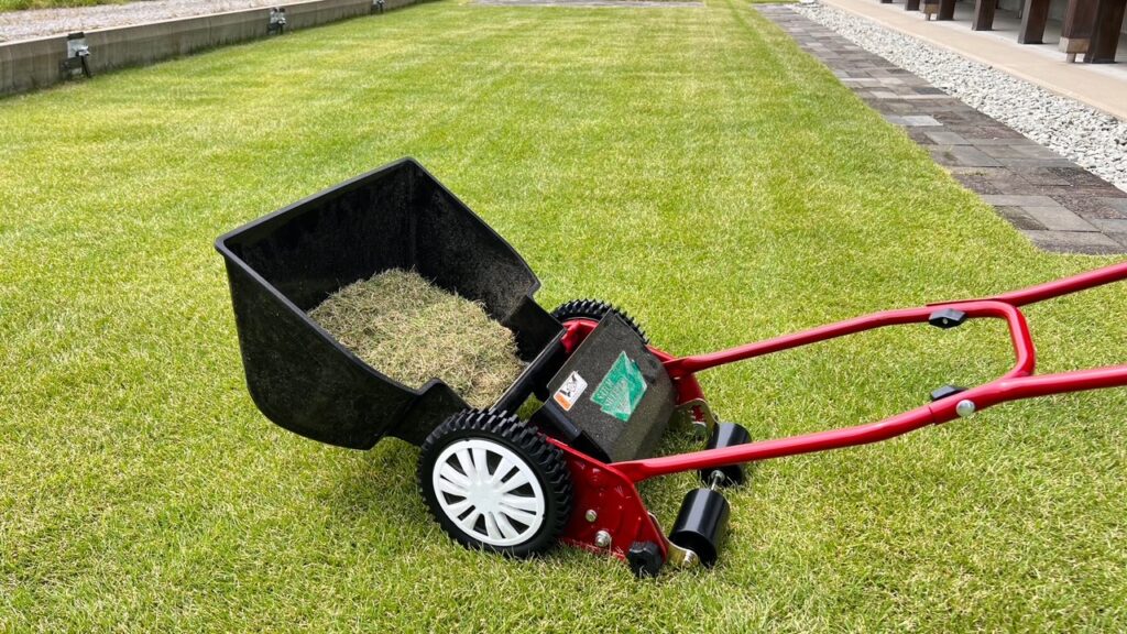 タイヤと連動して回転レーキが回り、芝生内のごみをかき集めてくれます。