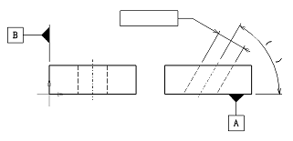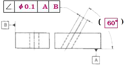 設計・製図基礎問題 トップページ 設計・製図基礎問題 問題-144:幾何公差・寸法指示 問題-144:幾何公差・寸法指示 次の説明に対応した幾何公差と寸法を、図形に指示してください。 実際の(再現した)軸線は、データムBに対して平行で、データム平面Aに対して理論的に 正確に60°傾いた直径0.1の円筒公差域の中になければならない。 解答を見る 解答 次の説明に対応した幾何公差と寸法は次のようになります。 実際の(再現した)軸線は、データムBに対して平行で、データム平面Aに対して理論的に 正確に60°傾いた直径0.1の円筒公差域の中になければならない。 一覧に戻る